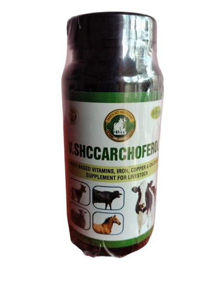 V.SHCCARCHOFEROL is a comprehensive nutritional supplement formulated to improve overall animal health and performance. It helps in treating anemia, iron deficiency, stress, and nutritional imbalances caused by parasitic infestations or poor diet. Enriched with essential minerals and vitamins, it supports blood formation, bone strength, and immune function in livestock.